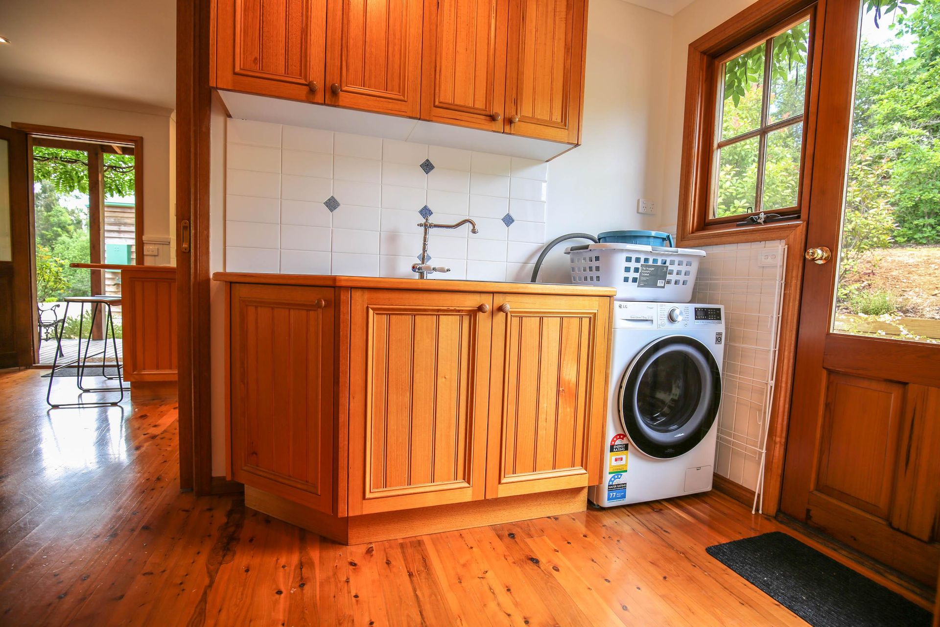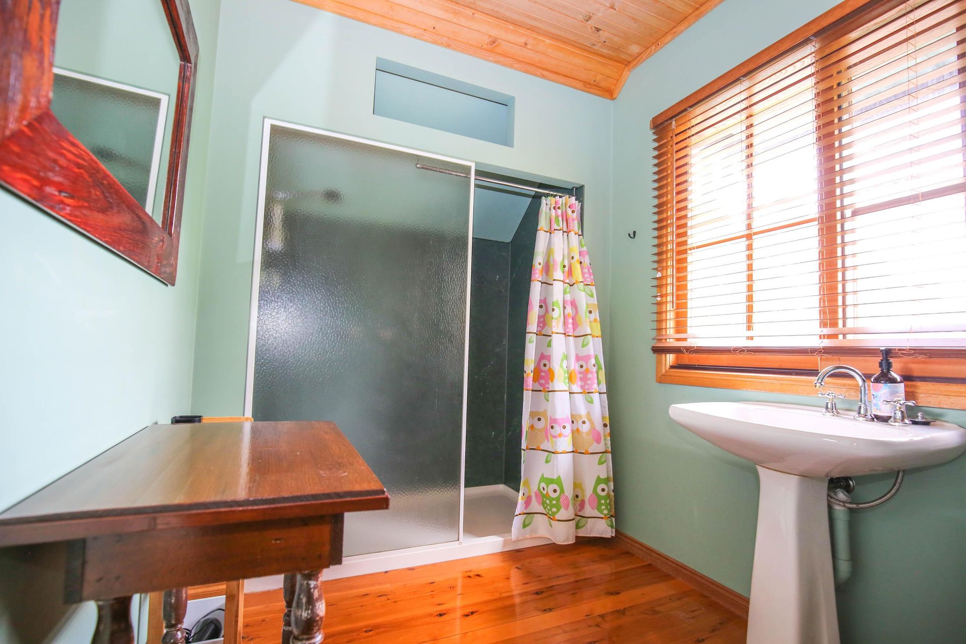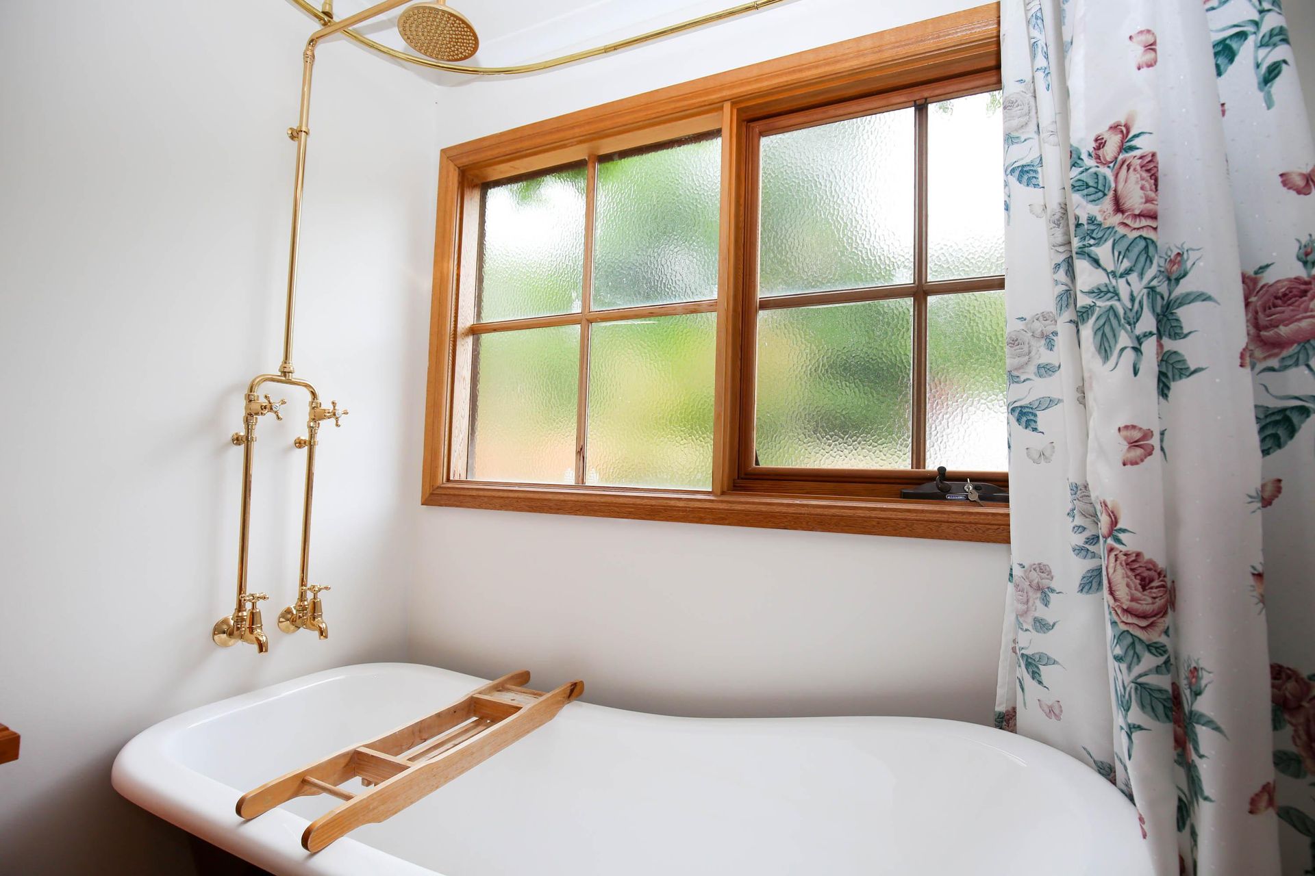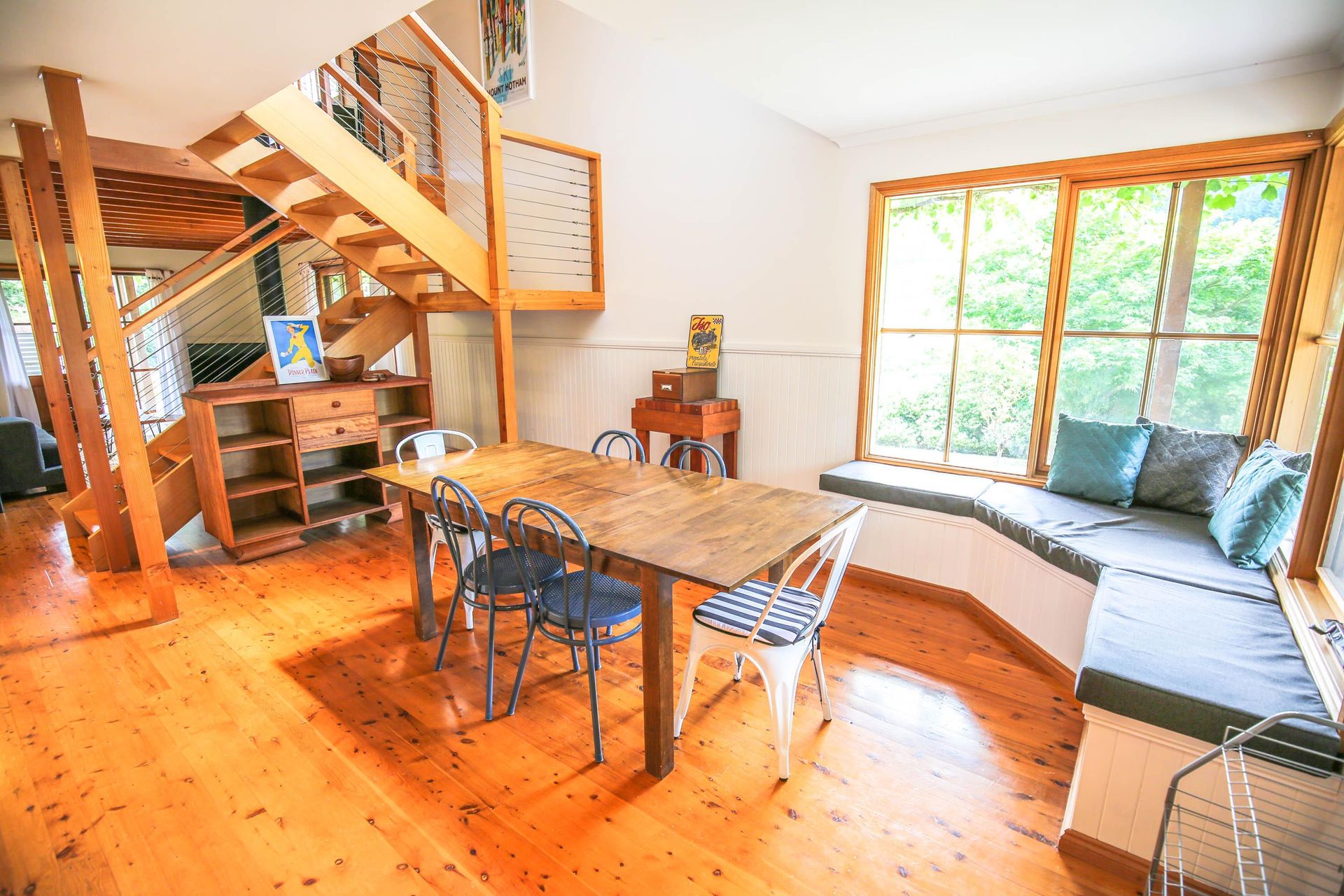 3 comfortable bedrooms, 2 with queen beds and 1 with 2 singles, the master bedroom in the upstairs loft has its own bathroom and French doors opening out onto a small balcony that looks straight out over the garden, pool and across the valley. The main downstairs bathroom features a shower over a quaint claw foot bath making this property ideal for 2 couples or a small family.