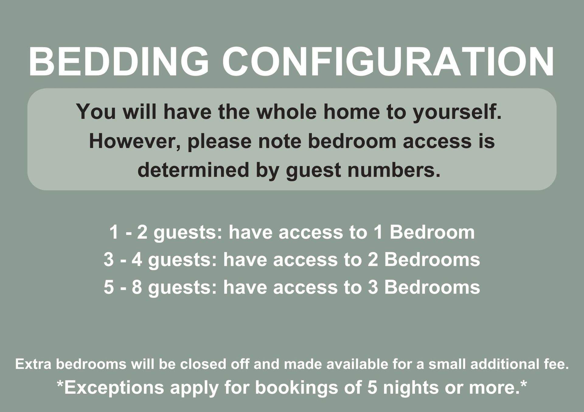 - 1-2 guests offers 1 bedroom, 3-4 guests offers 2 bedrooms, 5-6 guests offers 3 bedrooms. Exceptions apply for bookings of 5 nights or more.